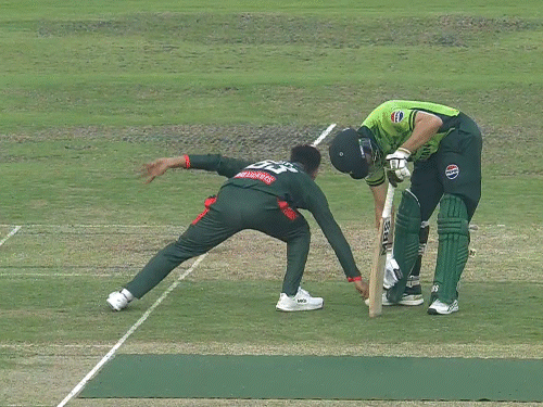 39वें ओवर में पाकिस्तान ने सलमान अली आगा का विकेट गंवाया। यहां पर मेहदी हसन मिराज की चौथी बॉल को रिजवान ने डिफेंड किया। गेंद लुढ़कते हुए नॉन-स्ट्राइकर पर खड़े सलमान की ओर गई। वे क्रीज से बाहर थे। मिराज गेंद की तरफ दौड़े, जिसे आगा ने रोक लिया। इससे पहले कि आगा झुककर गेंद उठाते, मिराज ने गेंद उठा ली और उसे स्टंप्स पर मार दी। यहां सलमान के पास क्रीज तक पहुंचने का मौका नहीं था, क्योंकि मेहदी सामने खड़े थे। इस तरह आउट होने से आगा नाखुश दिखे। उन्होंने मैदान से लौटते हुए ग्लव्स और हेलमेट उतार कर फेंक दी। रिशाद हुसैन को 3 विकेट