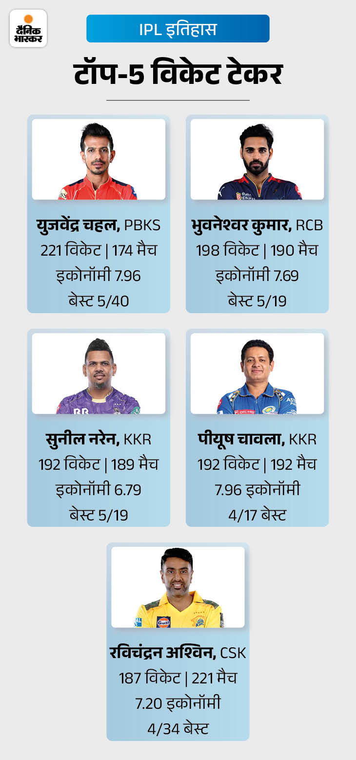 पंजाब किंग्स के लेग स्पिनर युजवेंद्र चहल टूर्नामेंट इतिहास के टॉप विकेट टेकर हैं। उनके नाम 174 मैच में 221 विकेट हैं। उनके बाद RCB के भुवनेश्वर कुमार ने 198 विकेट लिए हैं। KKR के सुनील नरेन भी 189 विकेट ले चुके हैं। दोनों अगले सीजन 200 विकेट के आंकड़े को पार कर सकते हैं।