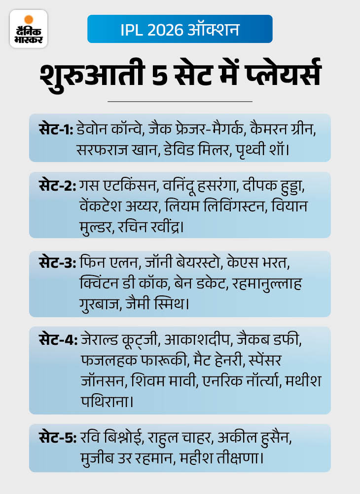ऑक्शन की शुरुआत इंटरनेशनल प्लेयर्स के सेट से होती है। हर सेट में अलग-अलग कैटेगरी के खिलाड़ी होते हैं। बल्लेबाज, ऑलराउंडर, विकेटकीपर, तेज गेंदबाज और स्पिनर्स के सीक्वेंस में खिलाड़ियों का नाम लिया जाता है। इंटरनेशनल प्लेयर्स के बाद उसी सीक्वेंस में अनकैप्ड यानी घरेलू खिलाड़ियों का नंबर आता है। यही प्रोसेस आखिरी खिलाड़ी का नाम आने तक चलती है।