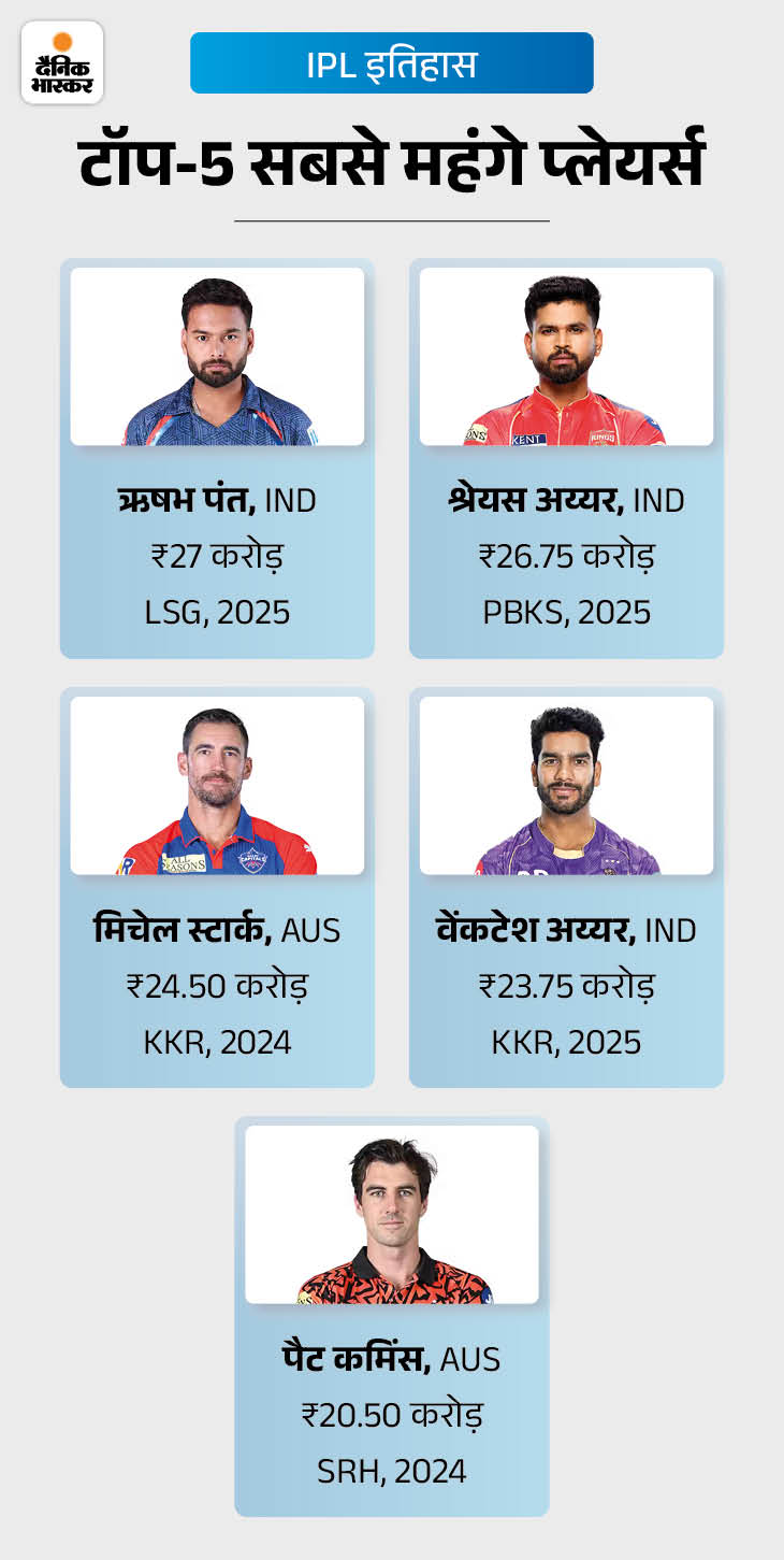 IPL इतिहास में ओवरऑल सबसे महंगे प्लेयर का रिकॉर्ड भारत के ऋषभ पंत के नाम हैं। जिन्हें पिछले ही सीजन लखनऊ सुपरजायंट्स ने 27 करोड़ रुपए में खरीदा था। उनके बाद पंजाब किंग्स के श्रेयस अय्यर सबसे महंगे रहे, जिन्हें भी पिछले ही सीजन 26.75 करोड़ रुपए की कीमत मिली।