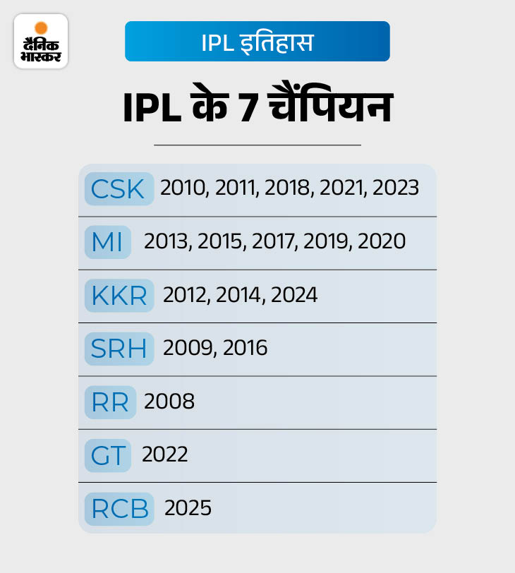 IPL की शुरुआत 2008 में हुई थी, तब राजस्थान रॉयल्स ने चेन्नई सुपर किंग्स को फाइनल हराकर पहले सीजन का खिताब जीता था। रॉयल चैलेंजर्स बेंगलुरु ने 2025 में पंजाब किंग्स को हराकर अपना पहला खिताब जीता। इस बीच CSK और MI ने 5-5 टाइटल जीत लिए। KKR 3 खिताब जीतकर तीसरी सबसे सफल टीम है।