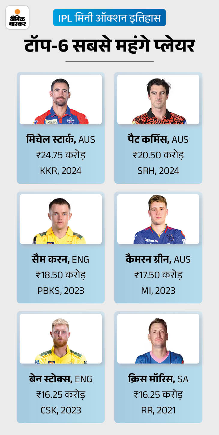 IPL मिनी ऑक्शन में अक्सर टीमें कुछ खिलाड़ियों पर बहुत ज्यादा रकम खर्च कर देती हैं। इतिहास में 6 खिलाड़ी ऐसे रहे, जिन्हें टीमों ने 16 करोड़ रुपए से ज्यादा कीमत देकर खरीदा। वहीं ऑक्शन इतिहास के सबसे महंगे प्लेयर ऋषभ पंत पिछले साल मेगा ऑक्शन में बिके। उन्हें 27 करोड़ रुपए में लखनऊ सुपरजायंट्स ने खरीदा था।