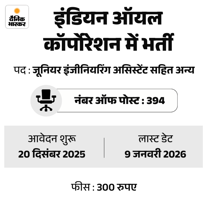 इंडियन ऑयल कॉर्पोरेशन लिमिटेड (IOCL) ने अप्रेंटिस के 394 पदों पर भर्ती निकाली है। उम्मीदवार IOCL की ऑफिशियल वेबसाइट iocl.com या अप्रेंटिसशिप पोर्टल पर जाकर फॉर्म भर सकते हैं।