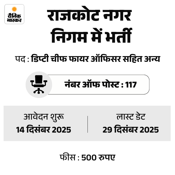 राजकोट नगर निगम (RMC) में 117 पदों पर भर्ती निकली है। इस भर्ती के लिए आवेदन की आखिरी तारीख 29 दिसंबर 2025 तय की गई है। उम्मीदवार ऑफिशियल वेबसाइट rmc.gov.in पर जाकर अप्लाई कर सकते हैं।