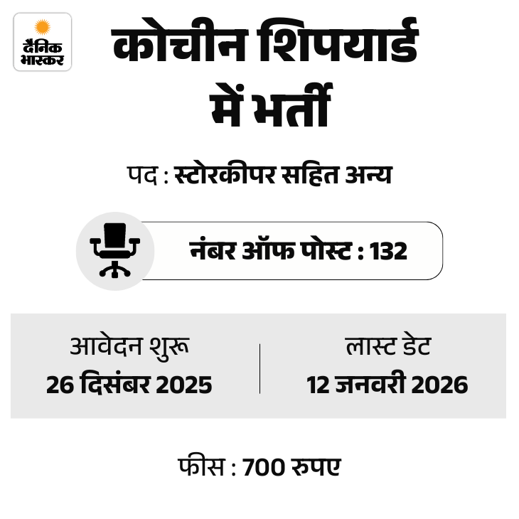 कोचीन शिपयार्ड लिमिटेड ने 132 पदों पर भर्ती निकाली है। उम्मीदवार ऑफिशियल वेबसाइट cochinshipyard.in पर जाकर आवेदन कर सकते हैं। कंप्यूटर, ईआरपी सिस्टम और तकनीकी सॉफ्टवेयर का नॉलेज रखने वाले उम्मीदवारों को प्राथमिकता दी जाएगी। फीस जमा करने की आखिरी तारीख 12 जनवरी 2026 तय की गई है।