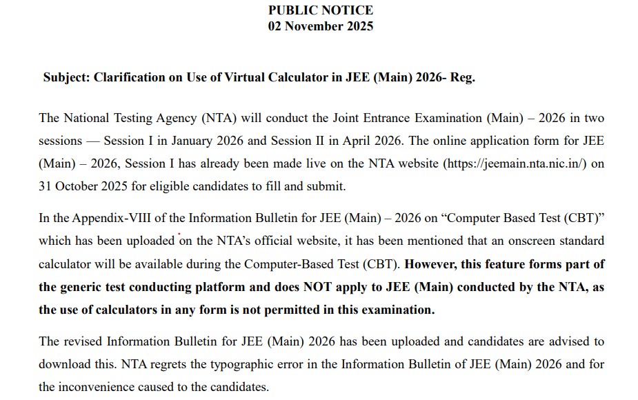 दरअसल NTA ने अपने आधिकारिक इन्फॉर्मेशन बुलेटिन में कहा था कि CBT मोड में एग्जाम के दौरान स्टूडेंट्स को एक ऑन-स्क्रीन स्टैंडर्ड कैलकुलेटर दिया जाएगा। अब NTA ने कहा कि यह फीचर सामान्य टेस्ट्स पर लागू होता है लेकिन JEE मेन्स में ऐसा नहीं होगा।