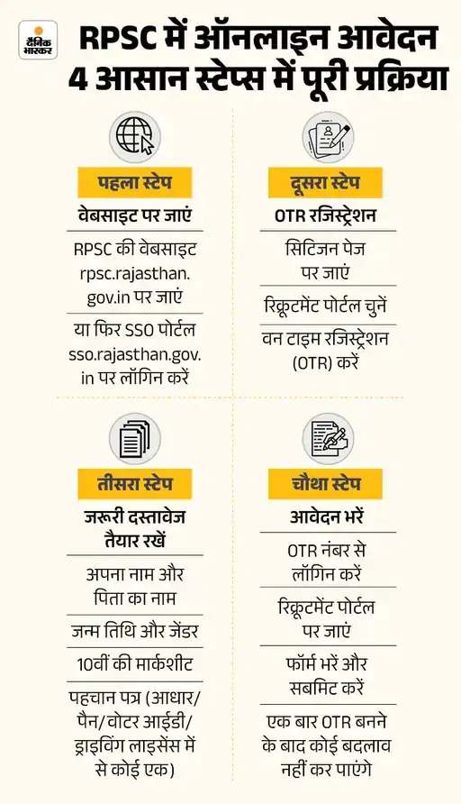 सचिव रामनिवास मेहता ने बताया-ऑफलाइन आवेदन स्वीकार नहीं किए जाएंगे। परीक्षा की तारीख, स्थान के बारे में बाद में सूचित कर दिया जाएगा। पदों की कैटेगरी जल्द जारी होगी। शैक्षणिक योग्यता, आवेदन प्रक्रिया और अन्य जानकारी संबंधी विस्तृत सूचनाएं आयोग की वेबसाइट पर उपलब्ध है।