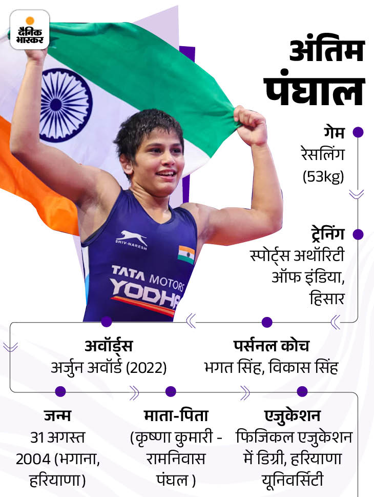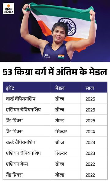 विनेश फोगाट के रिकॉर्ड की बराबरी कर चुकी अंतिम पंघाल ने करीब 4 महीने पहले क्रोएशिया में 2025 विश्व कुश्ती चैंपियनशिप में महिलाओं के 53 किग्रा वर्ग में कांस्य पदक जीता था। 21 वर्षीय रेसलर ने कांस्य पदक के मुकाबले में स्वीडन की एम्मा माल्मग्रेन को 9-1 से हराकर शानदार प्रदर्शन किया था।