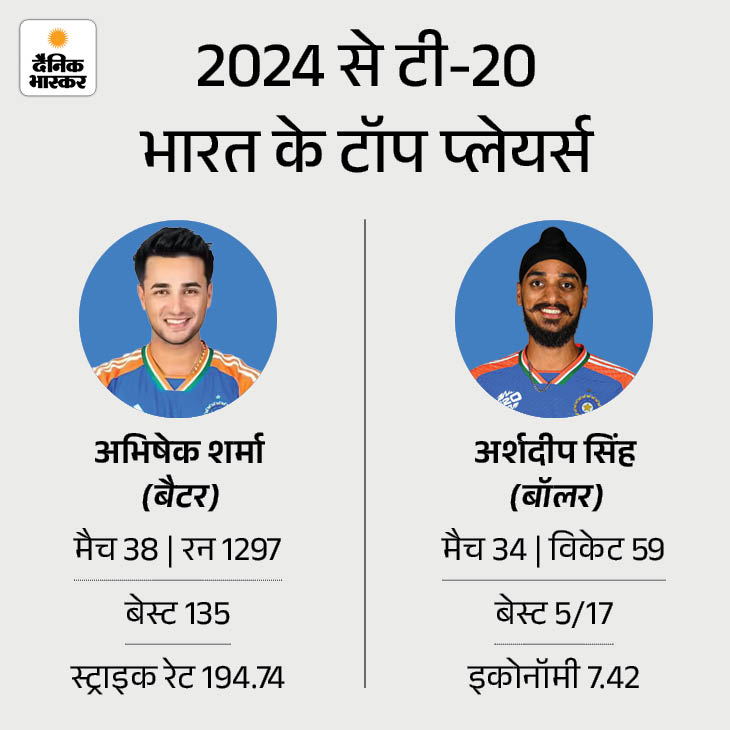2024 के बाद से अभिषेक शर्मा भारत की ओर से सबसे ज्यादा रन बनाने वाले बैटर हैं। उन्होंने 38 मैचों में 194.74 के स्ट्राइक रेट से 1297 रन बनाए हैं। वहीं, अर्शदीप सिंह 34 मैच में 59 विकेट ले चुके हैं।