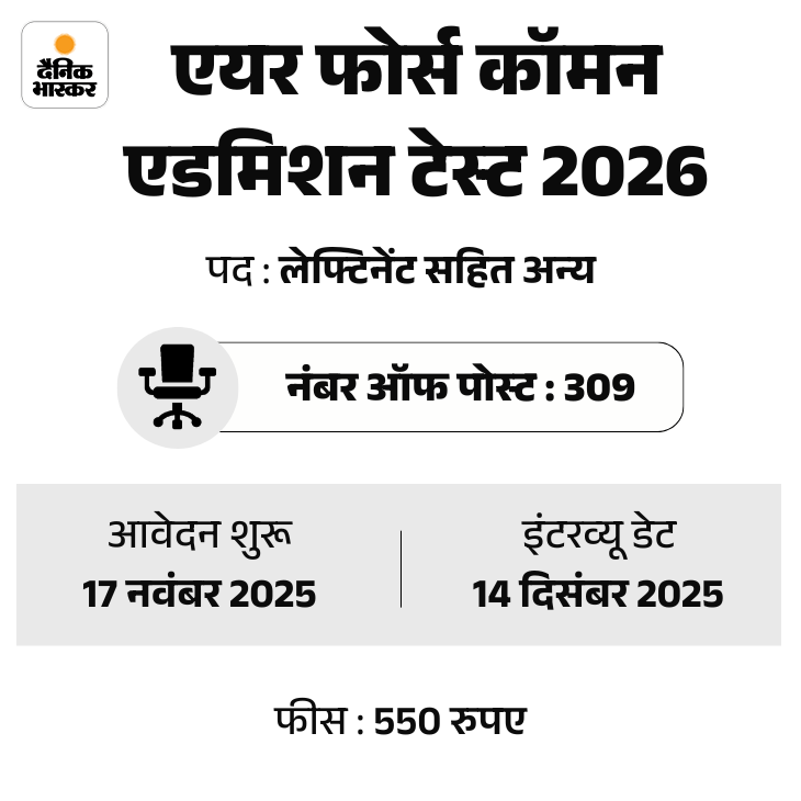 भारतीय वायुसेना ने एयरफोर्स कॉमन एडमिशन टेस्ट (AFCAT) 2025 के लिए आवेदन की शुरुआती और आखिरी तारीख में बदलाव किया है। इसके साथ ही एग्जाम डेट भी जारी कर दी है। पहले इस भर्ती के लिए 10 नवंबर से आवेदन शुरू थे।