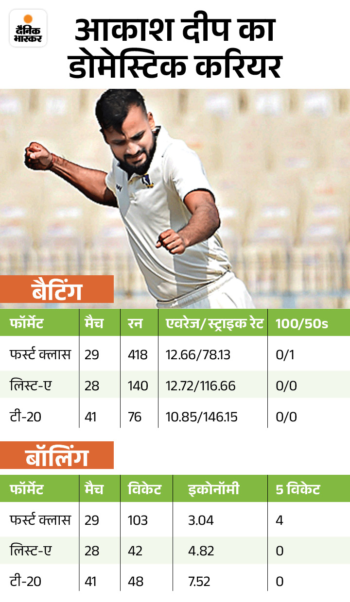 Akash Deep made his debut in the domestic Test series against England in February 2024. In the 2025 Anderson-Tendulkar Trophy, he got a chance in the Edgbaston Test replacing Jaspreet Bumrah, which he caught with both hands.