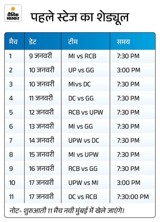 WPL की शुरुआत 9 जनवरी से WPL का चौथा संस्करण 9 जनवरी से 5 फरवरी तक नवी मुंबई और वडोदरा में दो स्टेज में खेला जाएगा। पहला मैच डिफेंडिंग चैंपियन रॉयल चैलेंजर्स बेंगलुरु और मुंबई इंडियंस के बीच 9 जनवरी को नवी मुंबई के डीवाई पाटिल स्टेडियम में खेला जाएगा।