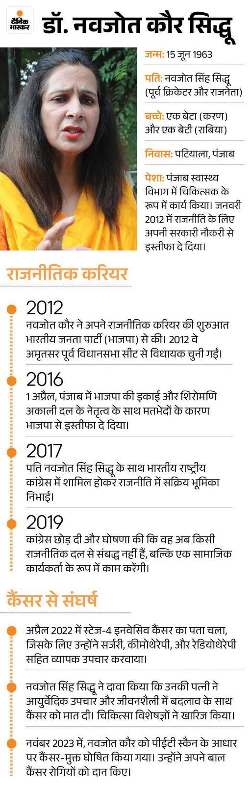नवजोत कौर ने कहा था- टिकट मिले या नहीं, चुनाव लड़ूंगी नवजोत सिद्धू की पत्नी नवजोत कौर सिद्धू ने 1 अक्टूबर को चंडीगढ़ में अमृतसर ईस्ट विधानसभा सीट से दावेदारी पेश की थी। नवजोत कौर ने कहा था कि वह जनता की सेवा करना चाहती हैं। यह काम विधायक बनकर ही बेहतर तरीके से हो सकता है। उनके क्षेत्र के लोग चाहते हैं कि वह चुनाव लड़ें। मैं 2027 के चुनाव के लिए तैयार हैं। नवजोत कौर ने साफ किया कि चुनाव लड़ने के लिए टिकट देना या न देना पार्टी हाईकमान का अधिकार है, लेकिन उन्होंने खुद की तैयारियां पहले से शुरू कर दी हैं।