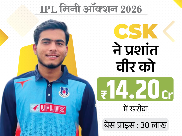 30 लाख के बेस प्राइस पर LSG और MI ने सबसे पहले पैडल उठाया। कुछ ही देर में CSK भी बोली की रेस में शामिल हो गई। बोली जब 4 करोड़ तक पहुंची तो MI बाहर हो गई। इसके बाद RR ने भी दावेदारी पेश की, लेकिन चेन्नई पीछे नहीं हटी। जब कीमत 6.60 करोड़ तक पहुंची, तब SRH भी बिडिंग वॉर में कूद पड़ी। साउथ की फ्रेंचाइजी के साथ हुई इस तगड़ी बोली ने आखिरकार प्रशांत वीर की कीमत 14.20 करोड़ रुपए तक पहुंचा दी।