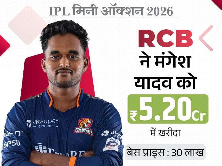 मंगेश का नाम ऑक्शन के आखिरी राउंड में आया था। 30 लाख रुपए की बेस प्राइस और कम पहचान के कारण लग रहा था कि उन पर ज्यादा बोली नहीं लगेगी। लेकिन RCB ने उनके नाम पर सबसे पहले पैडल उठाया। इसके बाद SRH के शामिल होते ही बोली तेजी से बढ़ी और कुछ ही समय में 1 करोड़ रुपए पार कर गई। देखते ही देखते दाम 4 करोड़ तक पहुंच गया और आखिरकार RCB ने मंगेश को 5.20 करोड़ रुपए में खरीद लिया।