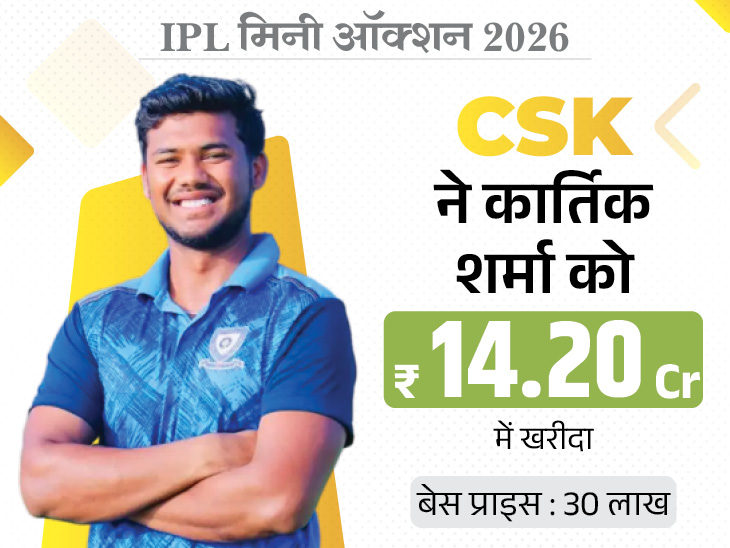 जब बोली 13 करोड़ तक पहुंची तो कोलकाता पीछे हट गई, इसके बाद SRH ने दाम बढ़ाकर 14.20 करोड़ रुपए कर दिए। एक वक्त ऐसा लगा कि कार्तिक को प्रशांत वीर से भी ज्यादा रकम मिलेगी, लेकिन आखिर में हैदराबाद ने हाथ खड़े कर दिए CSK ने उन्हें 14.20 करोड़ में खरीद लिया।
