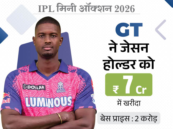 2 करोड़ रुपए की बेस प्राइस पर आए इस ऑलराउंडर के लिए सबसे पहले CSK ने बोली लगाई। इसके बाद गुजरात टाइटंस (GT) भी रेस में शामिल हो गई और बोली को 5 करोड़ रुपए तक पहुंचा दिया। थोड़ी देर बाद CSK ने फिर से दांव लगाया, लेकिन जैसे ही कीमत 7 करोड़ तक पहुंची, चेन्नई पीछे हट गई और आखिरकार गुजरात टाइटंस ने जेसन होल्डर को खरीद लिया।