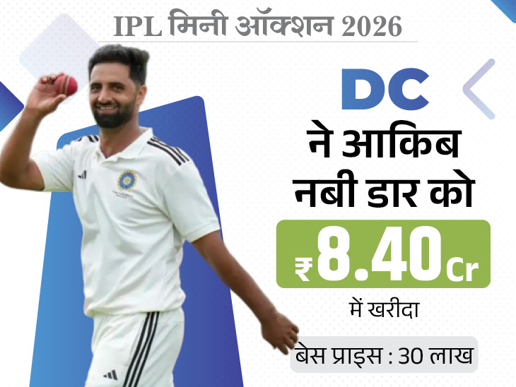 इससे पहले अनकैप्ड खिलाड़ियों के छठे सेट में यश धुल, अभिनव मनोहर और अथर्व तायडे अनसोल्ड रहे थे। लेकिन जैसे ही आकिब का नाम आया, दिल्ली कैपिटल्स (DC) ने पैडल उठाया और राजस्थान रॉयल्स (RR) भी रेस में शामिल हो गई। बोली जब 1 करोड़ रुपए तक पहुंची तो राजस्थान ने हाथ खींच लिए। इसके बाद RCB ने दाम बढ़ाया और SRH ने भी कोशिश की, लेकिन आखिरकार बाजी दिल्ली कैपिटल्स के नाम रही। ऐसा लगा मानो दिल्ली ने शुरुआत से ही आकिब को खरीदने का मन बना लिया हो।