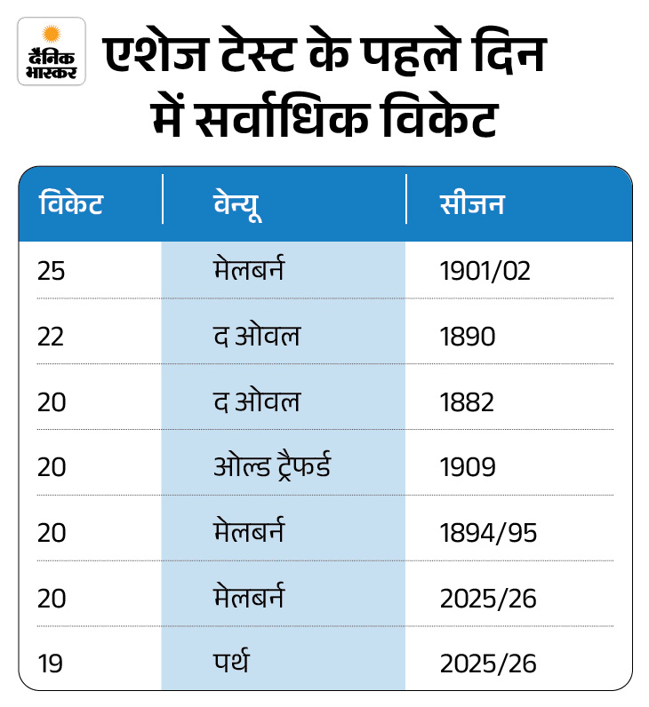 ऑस्ट्रेलिया की पहली पारी 45.2 ओवर में इंग्लैंड की पहली पारी 29.5 ओवर में खत्म हुई। यानी 75.1 ओवर में 20 विकेट गिर गए। यह 123 साल में पहली बार है, जब एशेज के दौरान मेलबर्न में पहले ही दिन इतने विकेट गिरे हों। इससे पहले 1901-02 में पहले दिन 25 विकेट गिरे थे। पढ़ें पूरी खबर…