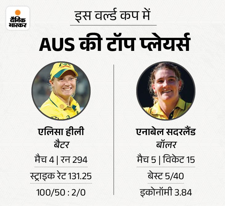 ऑस्ट्रेलिया की कप्तान एलिसा हीली पिछले मैच में इंग्लैंड के खिलाफ चोट की वजह से नहीं खेल पाईं थीं। वे टीम की टॉप बैटर हैं। भारत और बांग्लादेश के खिलाफ हीली ने लगातार 2 शतक लगाए थे। टूर्नामेंट में खेले 4 मैचों में हीली 294 रन बना चुकी हैं।
