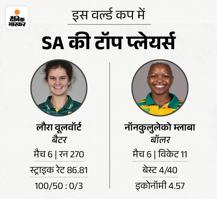 लौरा वूलवॉर्ट साउथ अफ्रीका की टॉप बैटर साउथ अफ्रीका की कप्तान लौरा वूलवॉर्ट ने टीम के लिए सबसे ज्यादा रन बनाए हैं। उन्होंने 6 मैच में 3 फिफ्टी लगाई है। लौरा ने 86.81 की स्ट्राइक रेट 270 रन बनाए हैं। मिडिल ऑर्डर बैटर नादिन डी क्लर्क ने भी अहम मौकों पर रन बनाए हैं। वे 6 मैच में 165 रन बना चुकीं हैं। 84 रन बेस्ट स्कोर है।