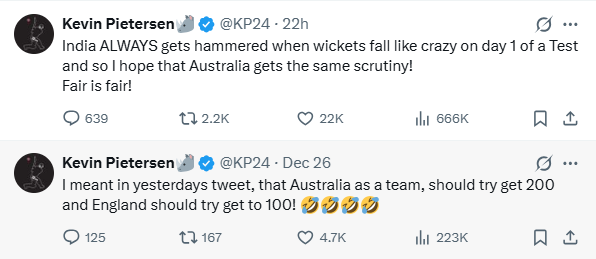 इंग्लैंड के पूर्व कप्तान पीटरसन ने X पर लिखा, ‘भारत में जब टेस्ट मैच के पहले दिन कई विकेट गिरते हैं, तो भारत को हमेशा कड़ी आलोचना का सामना करना पड़ता है। इसलिए मुझे उम्मीद है कि ऑस्ट्रेलिया को भी उसी तरह की आलोचना का सामना करना पड़ेगा। न्याय सबके लिए समान होना चाहिए।’
