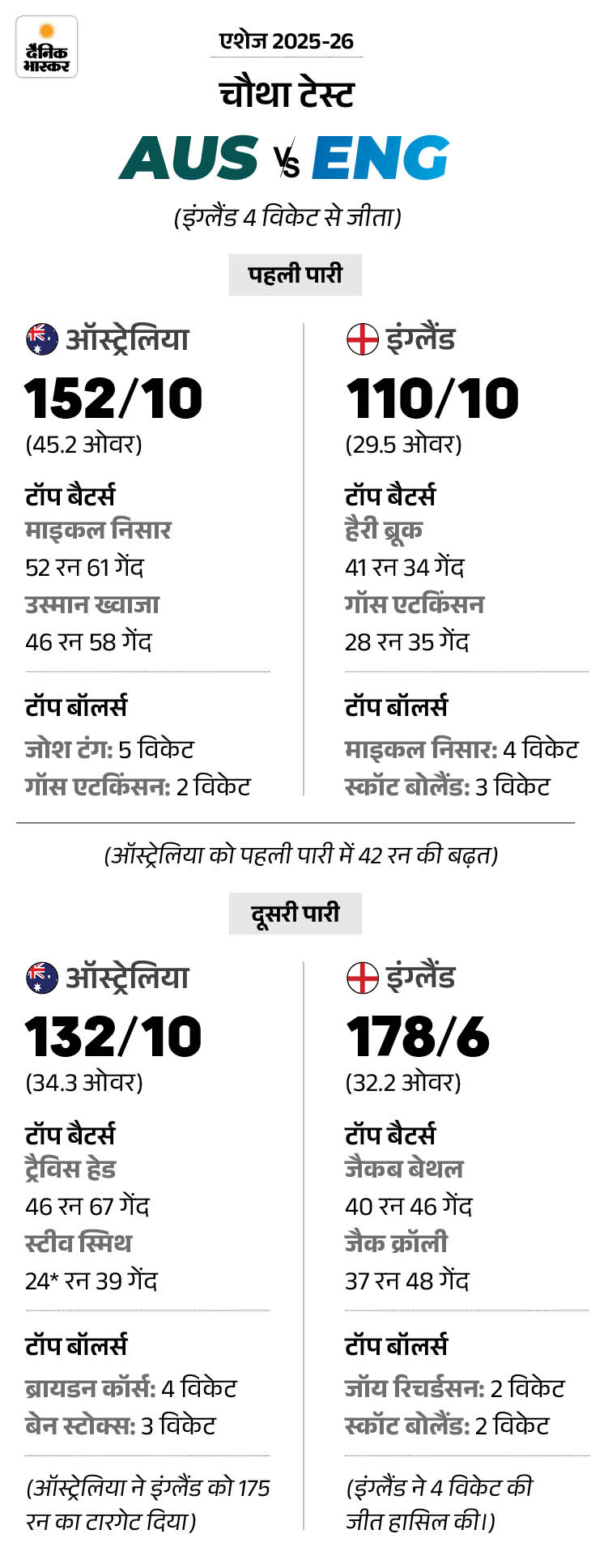 MCG में ऑस्ट्रेलिया-इंग्लैंड के बीच चल रही एशेज सीरीज का चौथा टेस्ट महज 2 दिन (26-27 दिसंबर) में समाप्त हो गया था। इसे इंग्लैंड ने 4 विकेट से जीता था। यह मैच 852 बॉल पर खत्म हो गया था, जोकि बॉल के लिहाज से एशेज सीरीज के 143 साल के इतिहास का चौथा सबसे छोटा टेस्ट है।
