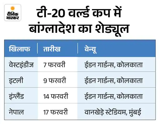 BCB ने मुस्तफिजुर रहमान को IPL से बाहर किए जाने के बाद सुरक्षा कारणों का हवाला देते हुए भारत में टी-20 वर्ल्ड कप के मैच खेलने से इनकार कर दिया था और ICC से अपने मैच श्रीलंका में शिफ्ट करने की अपील की थी।