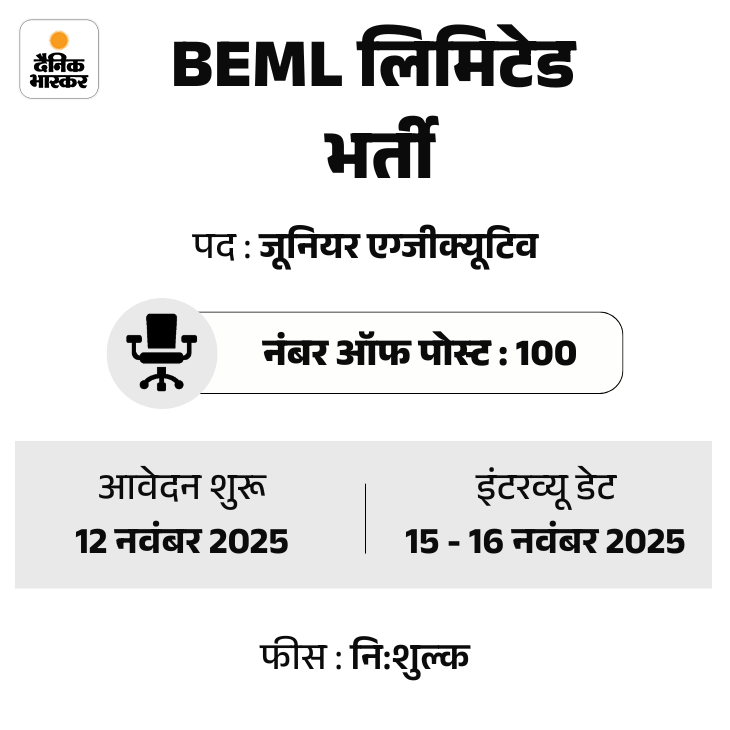 BEML Recruitment for 100 Junior Engineer Posts; Last Date: November 12, Interview on November 15-16 | सरकारी नौकरी: BEML में जूनियर इंजीनियर के 100 पदों पर निकली भर्ती; 12 नवंबर लास्ट डेट, 15-16 नवंबर को इंटरव्यू