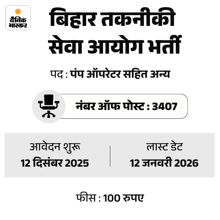 Bihar Technical Public Service Commission has announced recruitment for 3407 posts; age limit is 37 years, fee is Rs 100. | सरकारी नौकरी: बिहार तकनीकी लोक सेवा आयोग ने 3407 पदों पर निकाली भर्ती; एज लिमिट 37 साल, फीस 100 रुपए