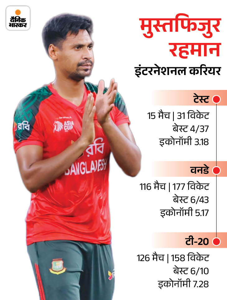 पिछले सीजन में रहमान 3 मैच खेले, 4 विकेट झटके रहमान ने पिछले सीजन में दिल्ली की ओर से 3 मैच खेले थे और 4 विकेट लिए थे। उन्हें दिल्ली ने 6 करोड़ रुपए में मिचेल स्टार्क की जगह अपने साथ जोड़ा था। स्टार्क ने वर्ल्ड टेस्ट चैंपियनशिप के फाइनल की तैयारियों के लिए आखिरी लीग मैच नहीं खेले थे। आगे मुस्तफिजुर रहमान के बारे में जानिए…