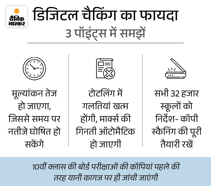 10वीं बोर्ड परीक्षाओं की कॉपियों की चेकिंग पहले की तरह कागज पर ही होगी। सीबीएसई के परीक्षा नियंत्रक संयम भारद्वाज के मुताबिक इस नई व्यवस्था से उत्तर पुस्तिकाओं के ट्रांसपोर्ट में लगने वाला समय और खर्च बचेगा।