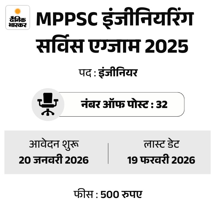मध्य प्रदेश लोक सेवा आयोग ने स्टेट इंजीनियरिंग सर्विस एग्जामिनेशन (ESE) 2025 का नोटिफिकेशन जारी कर दिया है। आयोग अपनी ऑफिशियल वेबसाइट mppsc.mp.gov.in पर 20 जनवरी 2026 से ऑनलाइन आवेदन शुरू करेगा।