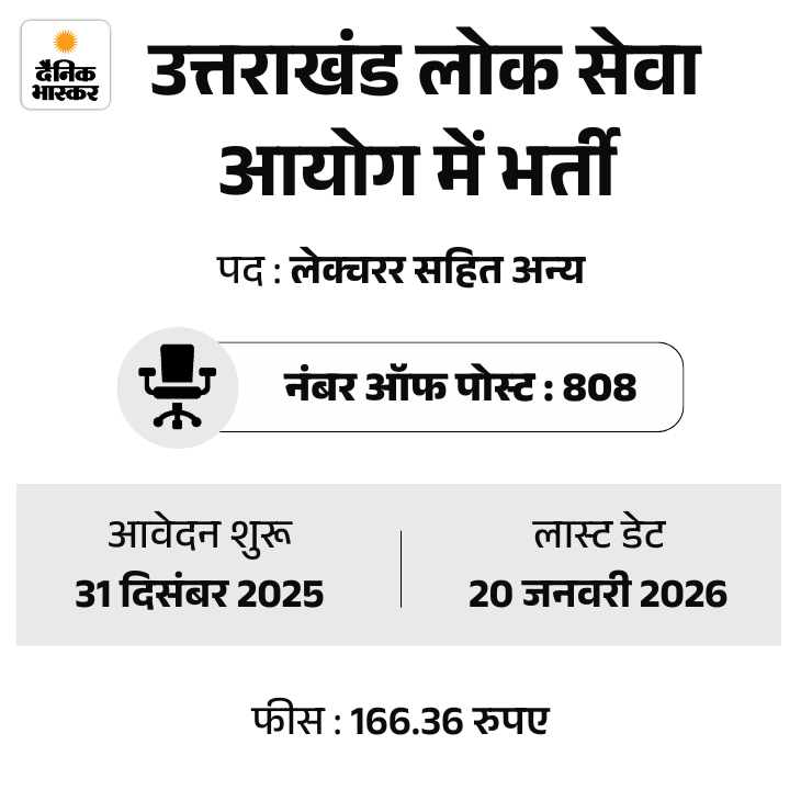 उत्तराखंड लोक सेवा आयोग (UKPSC) ने लेक्चरर के पदों पर भर्ती के लिए ऑफिशियल नोटिफिकेशन जारी किया है। इस भर्ती के लिए आवेदन आज से शुरू हैं। उम्मीदवार ऑफिशियल वेबसाइट psc.uk.gov.in पर जाकर अप्लाई कर सकते हैं। इसमें जनरल ब्रांच के 725 और महिला ब्रांच के लिए 83 पद शामिल हैं। करेक्शन विंडो 28 जनवरी 2026 से 06 फरवरी 2026 तक खुली रहेगी।