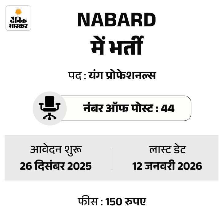 नेशनल बैंक फॉर एग्रीकल्चर एंड रूरल डेवलपमेंट (NABARD) ने नाबार्ड यंग प्रोफेशनल्स प्रोग्राम 2025 – 26 के पदों पर भर्ती निकाली है। उम्मीदवार ऑफिशियल वेबसाइट nabard.org पर जाकर आवेदन कर सकते हैं।