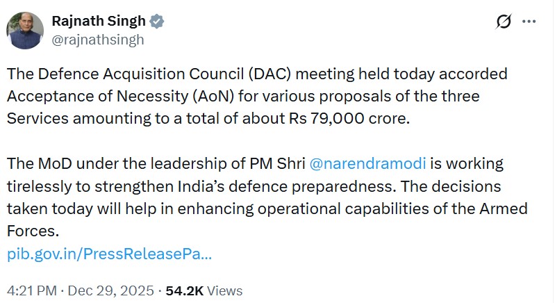 • रक्षा मंत्रालय ने 79 हजार करोड़ के सैन्य उपकरणों की खरीद को मंजूरी दी।