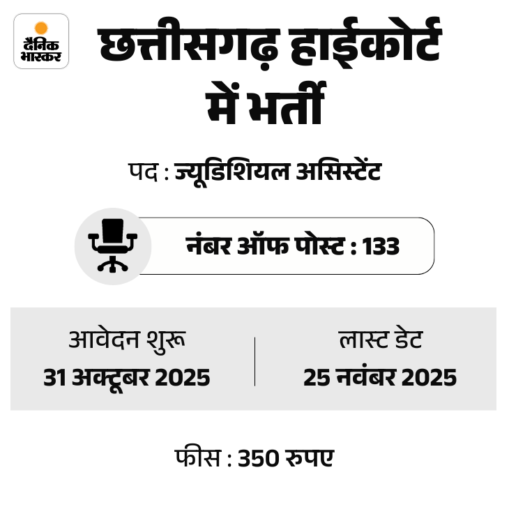 छत्तीसगढ़ हाईकोर्ट, बिलासपुर की ओर से असिस्टेंट ग्रेड थर्ड के पदों पर भर्ती निकली है। उम्मीदवार ऑफिशियल वेबसाइट highcourt.cg.gov.in पर जाकर आवेदन कर सकते हैं। इस भर्ती के लिए एग्जाम का आयोजन 4 जनवरी 2026 को किया जाएगा।