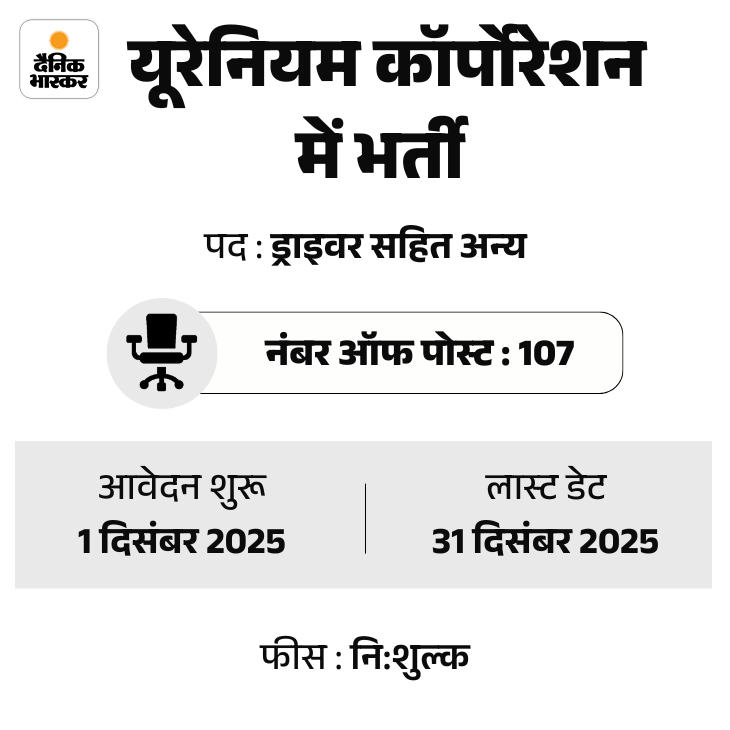 यूरेनियम कॉर्पोरेशन ऑफ इंडिया लिमिटेड यानी UCIL में अप्रेंटिस के 107 पदों पर वैकेंसी निकली है। 40 साल तक के 10वीं पास कैंडिडेट्स 31 दिसंबर तक इसमें आवेदन कर सकते हैं।
