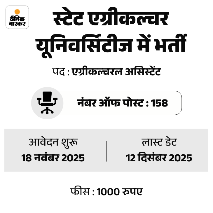 गुजरात स्टेट एग्रीकल्चर यूनिवर्सिटीज में 158 पदों पर भर्ती निकली है। 18 से 33 साल तक के एग्रीकल्चर ग्रेजुएट्स 12 दिसंबर तक इसके लिए आवेदन कर सकते हैं।