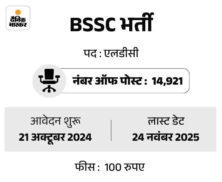 बिहार स्टाफ सिलेक्शन कमीशन (BSSC) की ओर से लोअर डिवीजन क्लर्क (LDC) के 14,921 पदों पर भर्ती निकली है। 18 से 37 साल तक के 12वीं पास कैंडिडेट्स 24 नवंबर तक इसमें आवेदन कर सकते हैं।