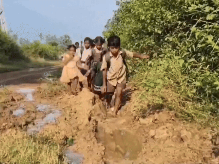 वीडियो में छोटे-छोटे बच्चे स्कूल यूनिफॉर्म में दिख रहे हैं। इनमें से ज्यादातर नंगे पैर स्कूल के दलदल भरे रास्ते को पार करते नजर आ रहे हैं। कुछ बच्चे बड़ी ही मुश्किल से खुद को फिसलने से बचाने का प्रयास कर रहे हैं।
