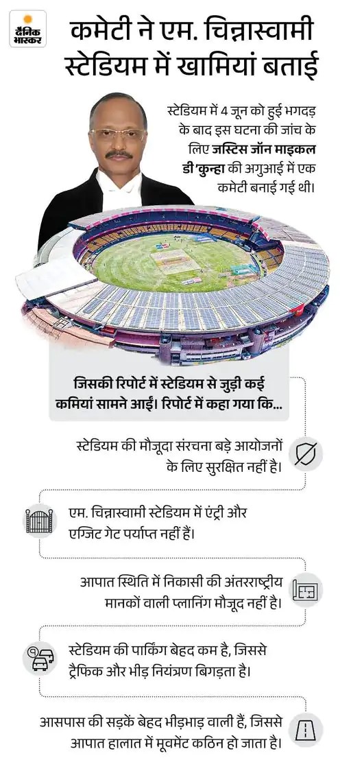 स्टेडियम में मैच कराने पर रोक लग गई थी भगदड़ हादसे के बाद जस्टिस जॉन माइकल डी कुन्हा कमेटी ने इस स्टेडियम को बड़े आयोजनों के लिए असुरक्षित बताया था, जिसके चलते यहां मैच कराने पर रोक लगा दी गई थी। इसके कारण ICC महिला वर्ल्ड कप 2025 के मुकाबले भी बेंगलुरु से हटाकर नवी मुंबई में आयोजित किए गए। वहीं, घरेलू टी-20 लीग महाराजा टी-20 ट्रॉफी को भी बेंगलुरु की बजाय मैसूर में शिफ्ट करना पड़ा था। हालांकि, पिछले सप्ताह स्टेडियम को दोबारा मैचों के आयोजन की मंजूरी मिल गई है।