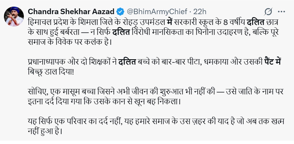 छात्र दलित समुदाय से है और शिमला के रोहरू सब डिवीजन के गवर्नमेंट प्राइमरी स्कूल का स्टूडेंट है। बच्चे के पिता ने कहा कि हेडमास्टर देवेंद्र के साथ-साथ टीचर बाबूराम और कृतिका ठाकुर लगभग 1 साल से बच्चे के साथ मारपीट कर रहे थे।