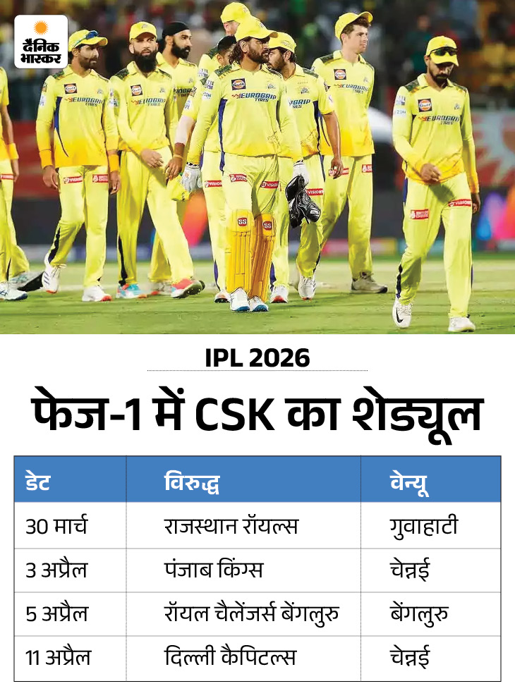ऋतुराज गायकवाड़ की कप्तानी वाली CSK और रियान पराग की कप्तानी वाली राजस्थान की टीमें अपने-अपने अभियान की शुरुआत 30 मार्च को गुवाहाटी में एक-दूसरे के खिलाफ करेंगी। IPL 2026 की शुरुआत 28 मार्च को RCB और SRH मैच के साथ होगी।