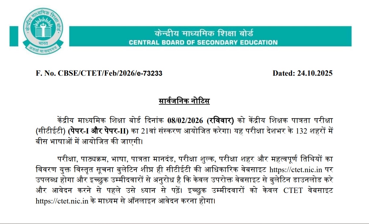 CTET यानी सेंट्रल टीचर्स एलिजिबिलिटी टेस्ट का फरवरी 2026 एडिशन 8 फरवरी को होगा। CBSE ने नोटिस जारी कर इसकी जानकारी दी है।