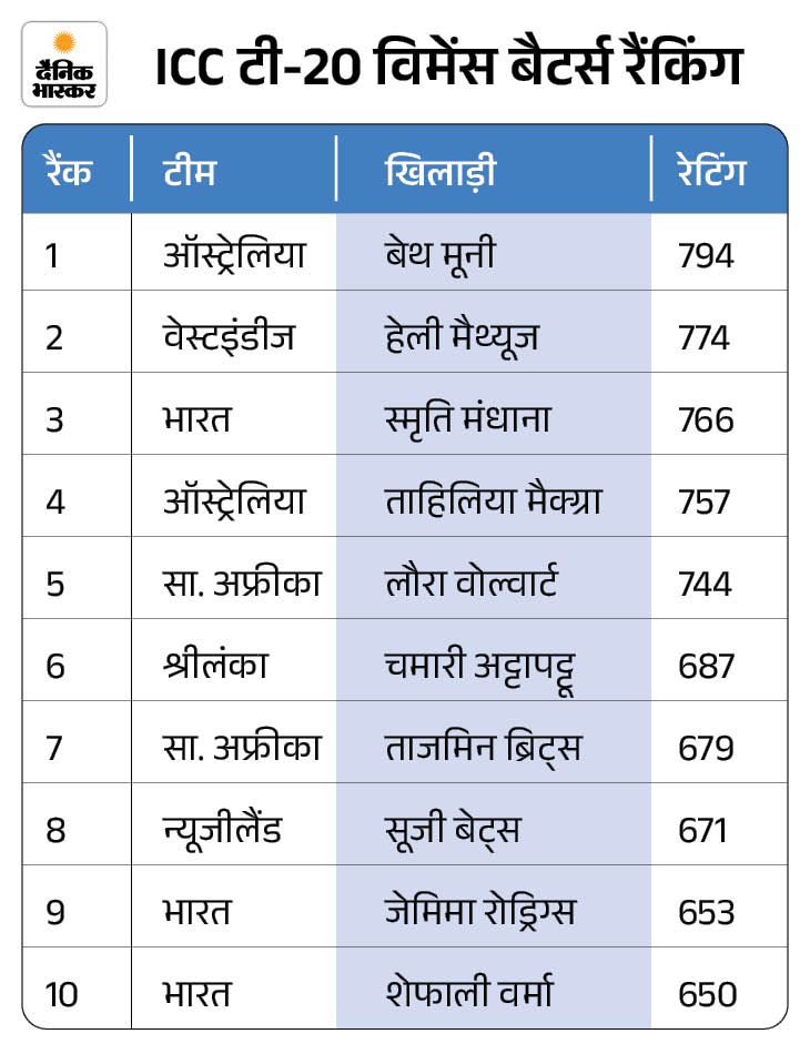 जेमिमा रोड्रिग्स को पांच स्थान का फायदा इस रैंकिंग अपडेट में दीप्ति की टीम-मेट जेमिमा रोड्रिग्स को भी बड़ा फायदा हुआ है। जेमिमा ने पांच स्थान की छलांग लगाकर टी-20 बल्लेबाजों में नौवां स्थान हासिल किया। विशाखापट्टनम में श्रीलंका के खिलाफ 44 गेंदों पर नाबाद 69 रन की मैच-विनिंग पारी खेलकर उन्होंने भारत को जीत दिलाई थी। टी-20 बल्लेबाजों के टॉप-10 में भारत की स्मृति मंधाना तीसरे और शेफाली वर्मा दसवें स्थान पर बनी हुई हैं।