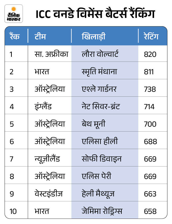 लौरा एक बार फिर नंबर-1 वनडे बल्लेबाजों की रैंकिंग में स्मृति मंधाना को एक स्थान का नुकसान हुआ है। साउथ अफ्रीका की लौरा वोल्वार्ट ने उन्हें पीछे छोड़ते हुए फिर से नंबर-1 पोजिशन हासिल कर ली। वोल्वार्ट ने आयरलैंड के खिलाफ घरेलू तीन मैचों की वनडे सीरीज में लगातार दो शतक लगाए, जिसे साउथ अफ्रीका ने 3-0 से जीता।
