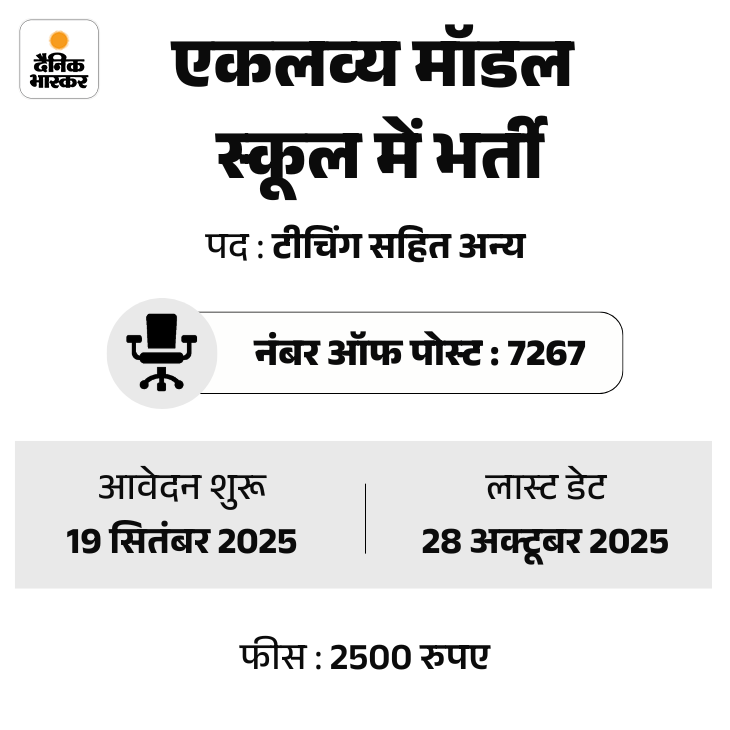 Eklavya Model School has extended the application date for recruitment to 7267 posts. Apply now by October 28. | सरकारी नौकरी: एकलव्य मॉडल स्कूल में 7267 पदों पर भर्ती के लिए आवेदन की तारीख बढ़ी, अब 28 अक्टूबर तक करें अप्लाई