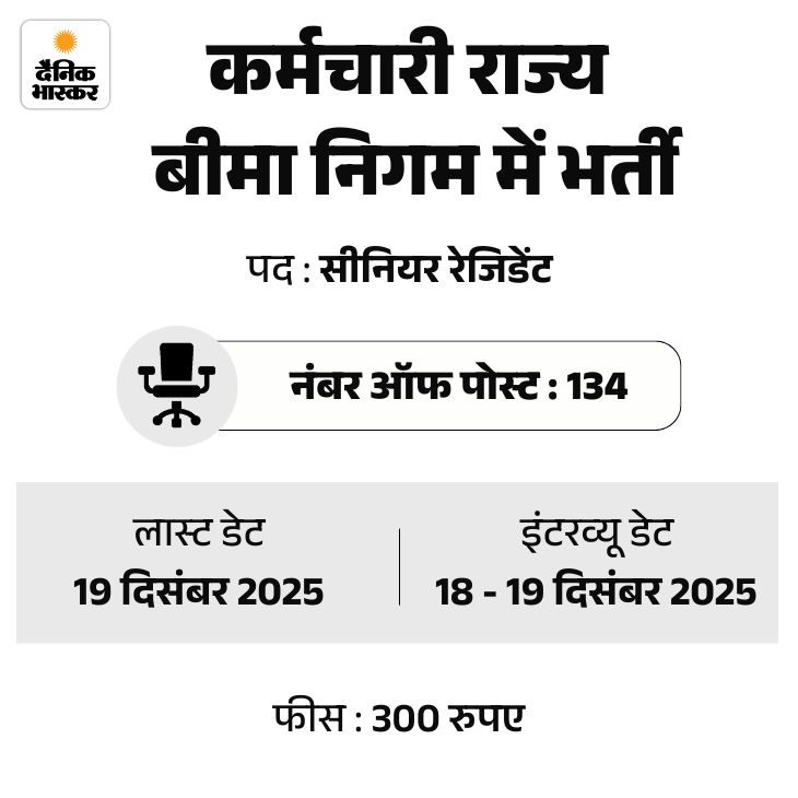 कर्मचारी राज्य बीमा निगम (ESIC) दिल्ली में रेडियोलॉजी, सर्जरी, आई, ब्लड बैंक, माइक्रोबायोलॉजी, स्किन समेत अपने विभिन्न डिपार्टमेंट के लिए सीनियर रेजिडेंट की भर्ती निकली है। आवेदन करने वाले उम्मीदवारों के इंटरव्यू 18 और 19 दिसंबर 2025 को लिए जाएंगे।