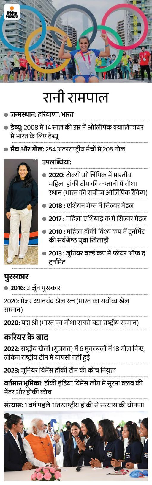 रानी रामपाल की अगुआई में भारतीय महिला हॉकी टीम टोक्यो 2020 ओलिंपिक में चौथे स्थान पर रही थी। ओलिंपिक में टीम का सर्वश्रेष्ठ प्रदर्शन था। रानी रामपाल को अर्जुन व भीम अवॉर्ड से नवाजा जा चुका है। फिलहाल रानी रामपाल गर्वमेंट हॉकी नर्सरी पटियाला में खिलाड़ियों को कोचिंग देती हैं।